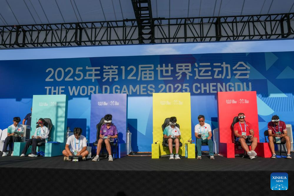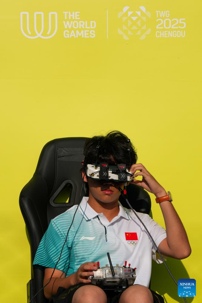 He Yutong of China competes during the Drone Sports Drone Racing at The World Games 2025 in Chengdu, southwest China's Sichuan Province, Aug. 15, 2025. (Xinhua/Li Bo)