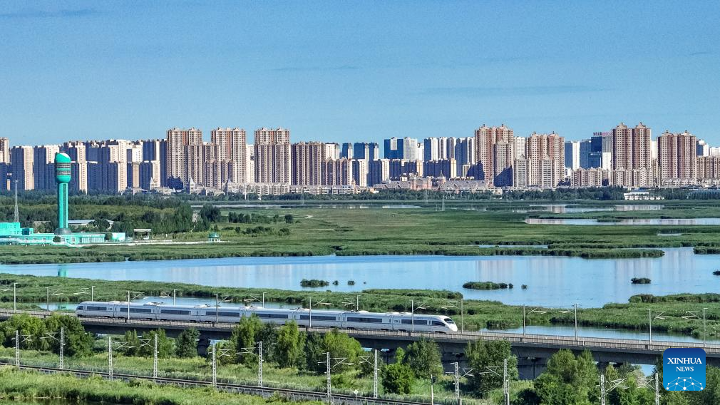 This drone photo taken on Aug. 17, 2025 shows a high-speed train running along the Harbin-Qiqihar railway. On Aug. 17, 2015, the Harbin-Qiqihar railway, Heilongjiang's first high-speed railway, from the provincial capital Harbin to Qiqihar City, was put into operation and became China's northernmost of its kind in operation in the northeastern province of China.