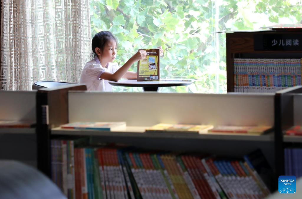 A child browses a book at a bookstore in Boxing County of Binzhou City, east China's Shandong Province, Aug. 16, 2025. (Photo by Chen Bin/Xinhua)