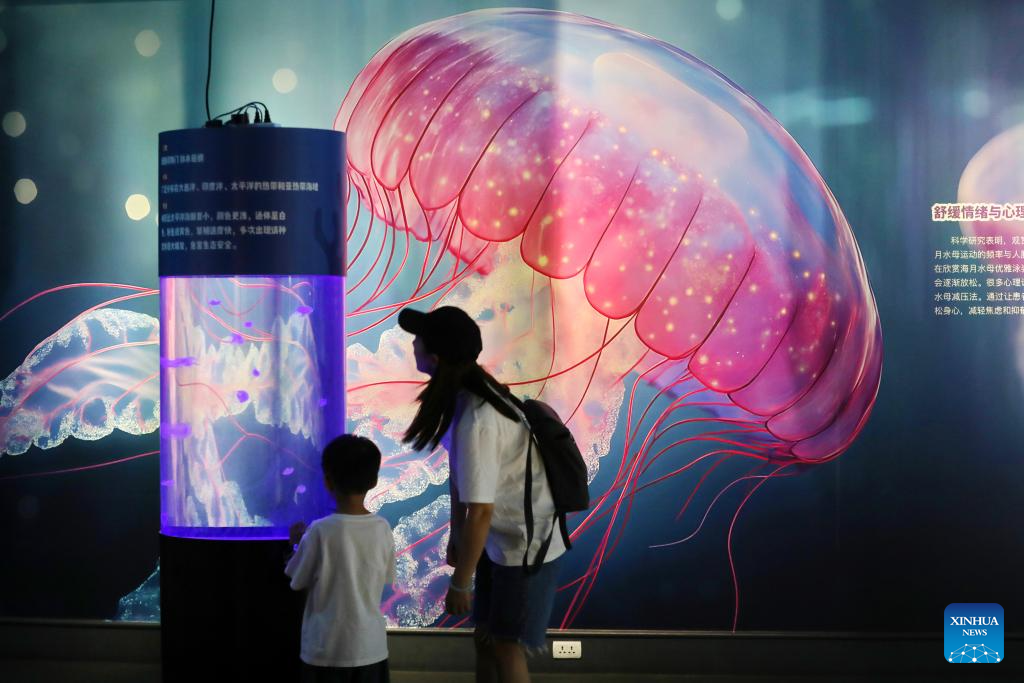 A child visits an exhibition themed on Jellyfish at a museum in Jiaxing City, east China's Zhejiang Province, Aug. 16, 2025. (Photo by Jin Peng/Xinhua)