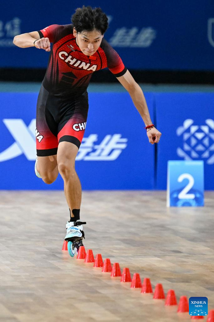 Zhang Hao of China competes during the Men's Speed Slalom Gold Medal Final against Fu Yu of China of Inline Freestyle Skating event at The World Games 2025 in Chengdu, southwest China's Sichuan Province, Aug. 16, 2025. (Xinhua/Xie Jianfei)