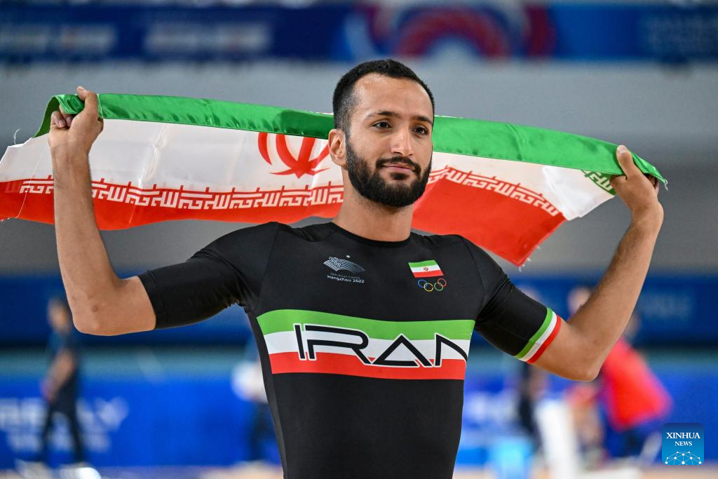 Reza Lesani of Iran celebrates after winning the Men's Speed Slalom Bronze Medal Final against Amirmohammad Savari Jamalouei of Iran of Inline Freestyle Skating event at The World Games 2025 in Chengdu, southwest China's Sichuan Province, Aug. 16, 2025. (Xinhua/Xie Jianfei)