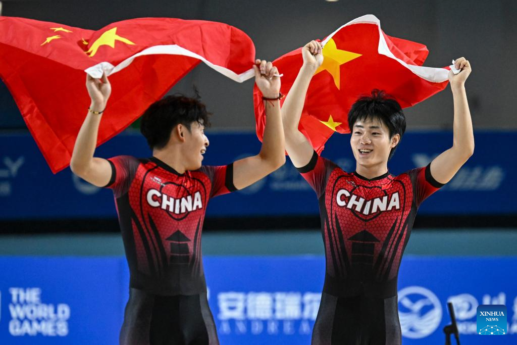 Zhang Hao (R) and Fu Yu of China celebrate after their Men's Speed Slalom Gold Medal Final of Inline Freestyle Skating event at The World Games 2025 in Chengdu, southwest China's Sichuan Province, Aug. 16, 2025. (Xinhua/Xie Jianfei)