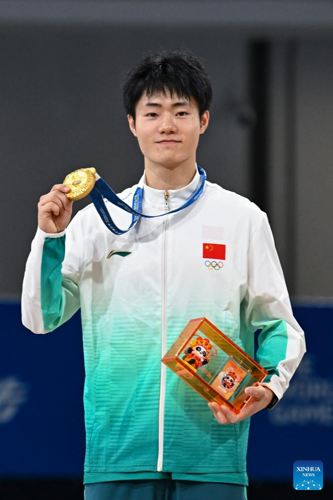 Gold medalist Zhang Hao of China pose during the victory ceremony for the Men's Speed Slalom event of Inline Freestyle Skating event at The World Games 2025 in Chengdu, southwest China's Sichuan Province, Aug. 16, 2025. (Xinhua/Xie Jianfei)