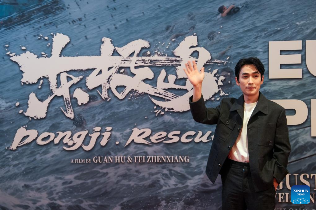 Chinese actor Zhu Yilong waves during the European premiere of the film Dongji Rescue, in London, Britain, Aug. 15, 2025. Dongji Rescue tells the story of how Chinese fishermen risked their lives to rescue over 300 British prisoners of war from the Japanese ship Lisbon Maru in 1942. The European premiere of the film opened Friday night in London. (Xinhua/Wu Lu)