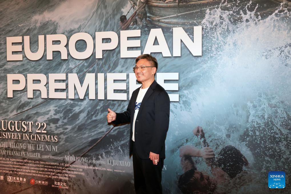 Director Fei Zhenxiang poses for photos during the European premiere of the film Dongji Rescue, in London, Britain, Aug. 15, 2025. Dongji Rescue tells the story of how Chinese fishermen risked their lives to rescue over 300 British prisoners of war from the Japanese ship Lisbon Maru in 1942. The European premiere of the film opened Friday night in London. (Photo by Wang Muhan/Xinhua)