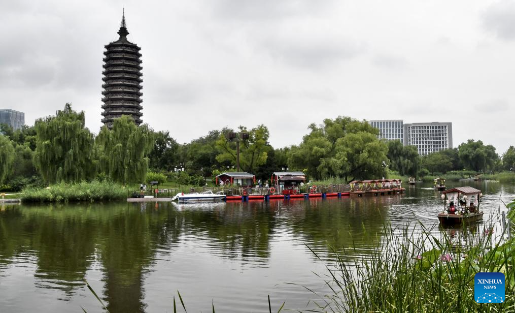 People take a boat tour on a lake by the Grand Canal in Tongzhou District of Beijing, capital of China, Aug. 16, 2025. Connecting Beijing and Hangzhou in east China's Zhejiang Province, the Grand Canal is the world's longest artificial waterway.