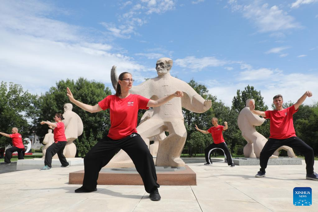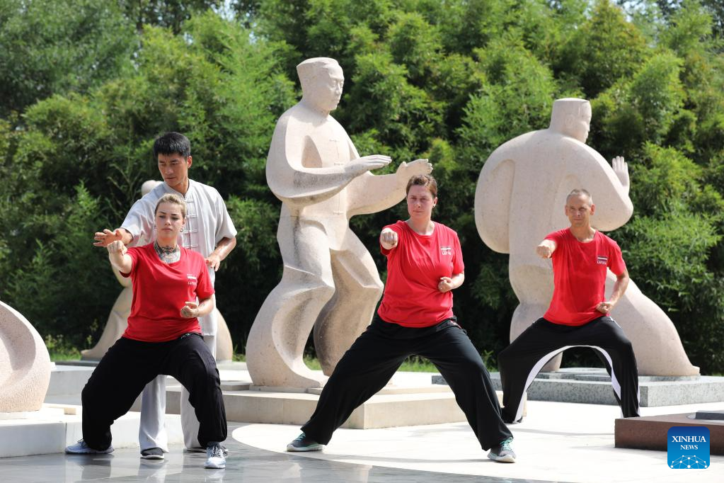 Latvian students practice Tai Chi at Chenjiagou Village of Wenxian County, Jiaozuo City, central China's Henan Province, Aug. 16, 2025. Twenty-nine students from Latvia are here on a 15-day program to study Tai Chi and experience the charm of Chinese martial arts.