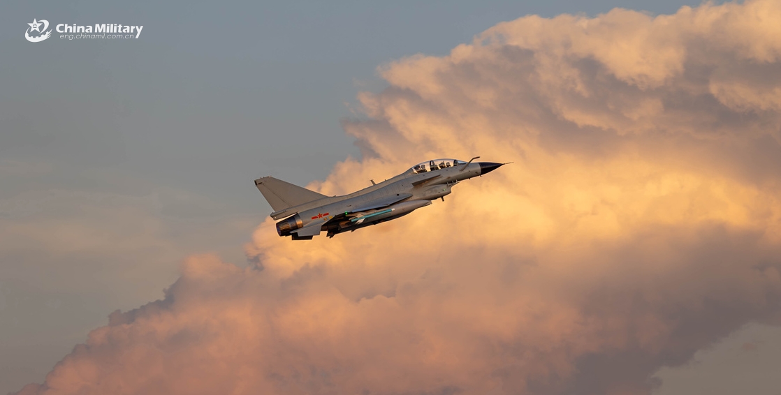 A two-seat J-10S fighter jet attached to Chinese PLA Air Force flies towards the designated airspace during an air-combat training exercise. (eng.chinamil.com.cn/Photo by Wang Wen and Lan Shanhu)