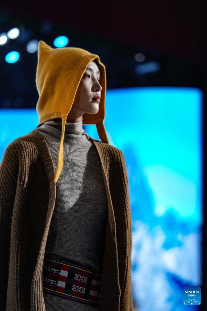 This photo taken on Jan. 5, 2025 shows a model presenting Tibetan costume during a fashion culture week in Lhasa, southwest China's Xizang Autonomous Region. Traditional Tibetan costumes, after centuries of evolution and development, have formed rich styles and unique features. (Xinhua/Jigme Dorje)