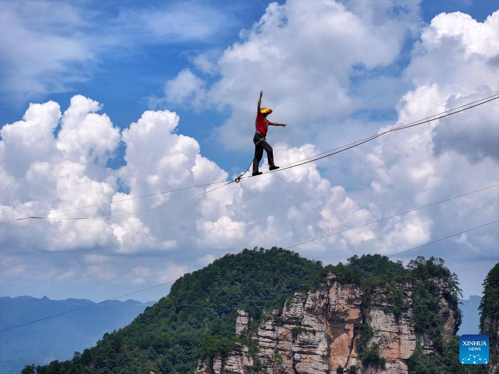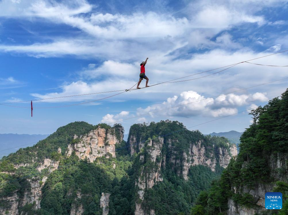 This photo taken on Aug. 18, 2025 shows He Jinyi of China competing during the 2025 "Slackline King" Championship at Huangshizhai scenic spot in Zhangjiajie, central China's Hunan Province. Some 20 elite slackline athletes from China, France, Brazil, and other countries and regions competed in the event. (Photo by Guo Liliang/Xinhua)