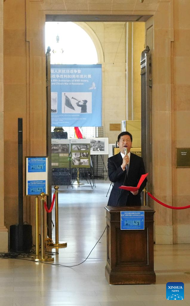 Chinese Consul General in San Francisco Zhang Jianmin speaks during the opening ceremony of a photo exhibition commemorating the 80th anniversary of the victory of the Chinese People's War of Resistance Against Japanese Aggression and the World Anti-Fascist War at Herbst Theatre in San Francisco, the United States, Aug. 17, 2025. (Xinhua/Wu Xiaoling)