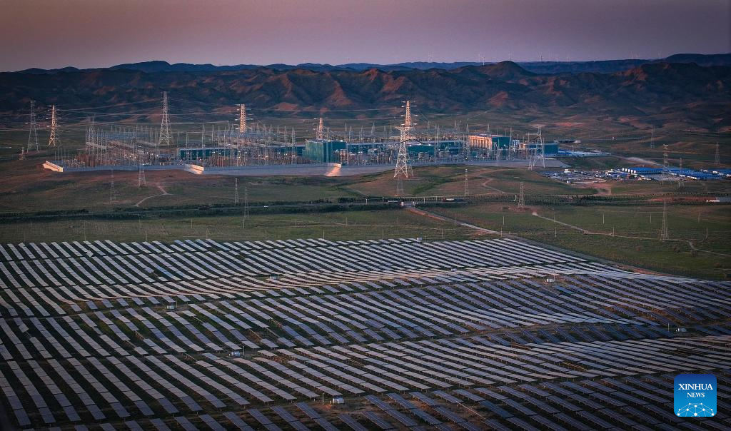 An aerial drone photo taken on Aug. 19, 2025 shows the Zhongning converter station and the supporting new energy project of the Ningxia-Hunan ±800 kV ultra-high voltage (UHV) direct current transmission project in Zhongwei City, northwest China's Ningxia Hui Autonomous Region. The Ningxia-Hunan ±800 kV UHV direct current transmission project, which brings electricity from northwest China's Ningxia Hui Autonomous Region to central China's Hunan Province, was put into operation for power transmission on Wednesday.
