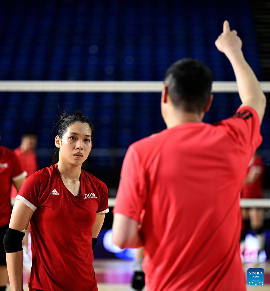 Wang Mengjie of team China reacts during a training session ahead of the FIVB Women's Volleyball World Championship in Chiang Mai, Thailand, Aug. 21, 2025. (Xinhua/Hou Zhaokang)