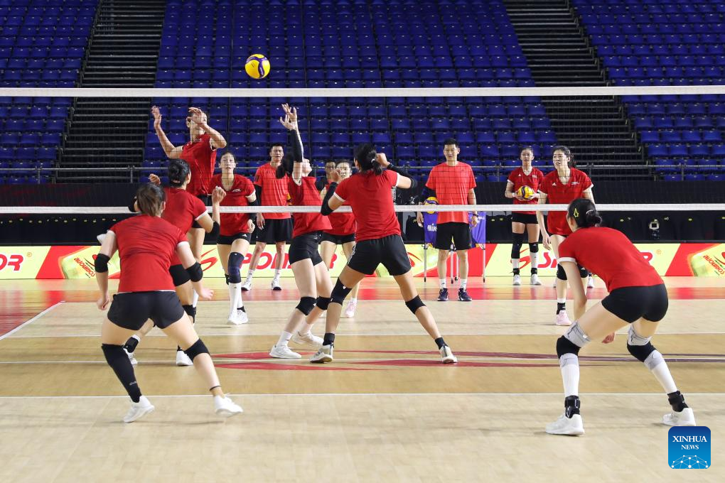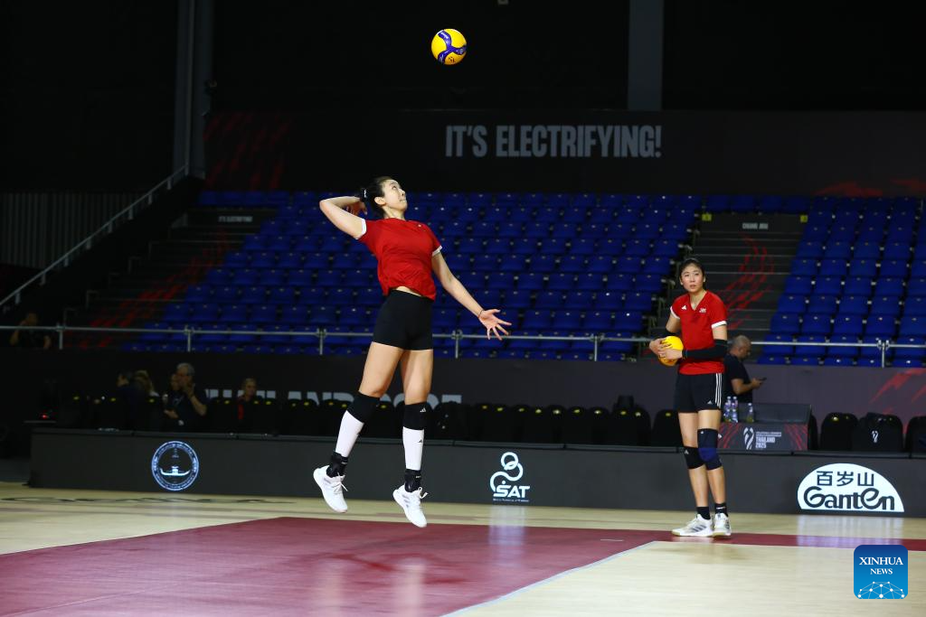 Players of team China take part in a training session ahead of the FIVB Women's Volleyball World Championship in Chiang Mai, Thailand, Aug. 21, 2025. (Xinhua/Hou Zhaokang)
