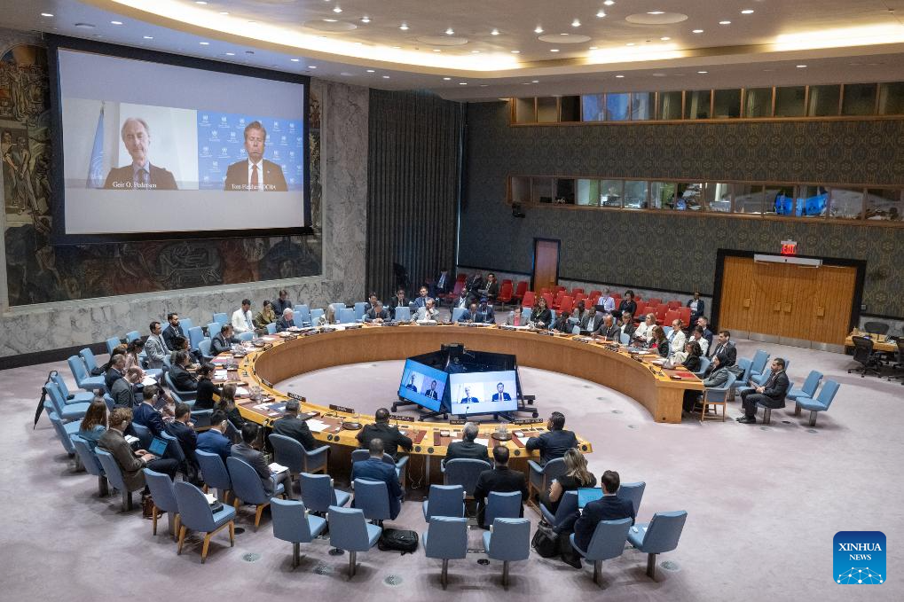 UN Special Envoy for Syria Geir Pedersen (L, on screens) speaks via a video link at a Security Council meeting at the UN headquarters in New York, on Aug. 21, 2025. Pedersen on Thursday warned of "a worsening political climate" amid a precarious security situation in Syria. (Eskinder Debebe/UN Photo/Handout via Xinhua)