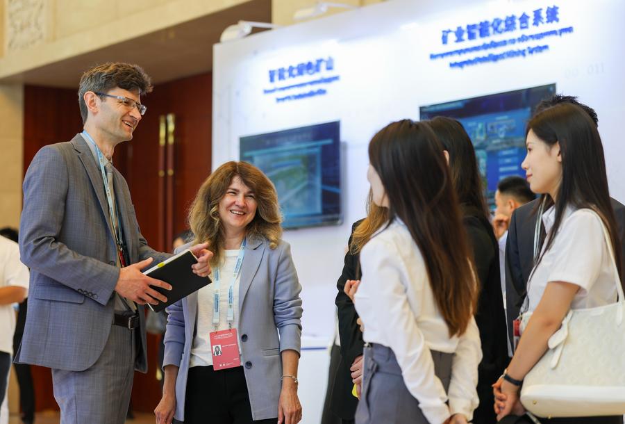 Guests and exhibitors communicate at the interactive experience zone during the 2025 Shanghai Cooperation Organization (SCO) Digital Economy Forum in north China's Tianjin, July 11, 2025. (Xinhua/Sun Fanyue)