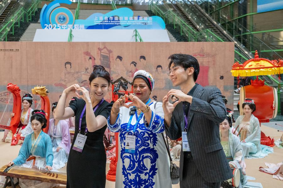 A representative interacts with the media at the site of the Shanghai Cooperation Organization (SCO) Media and Think Tank Summit in Zhengzhou, capital of central China's Henan Province, July 25, 2025. (Xinhua/Hu Jingwen)