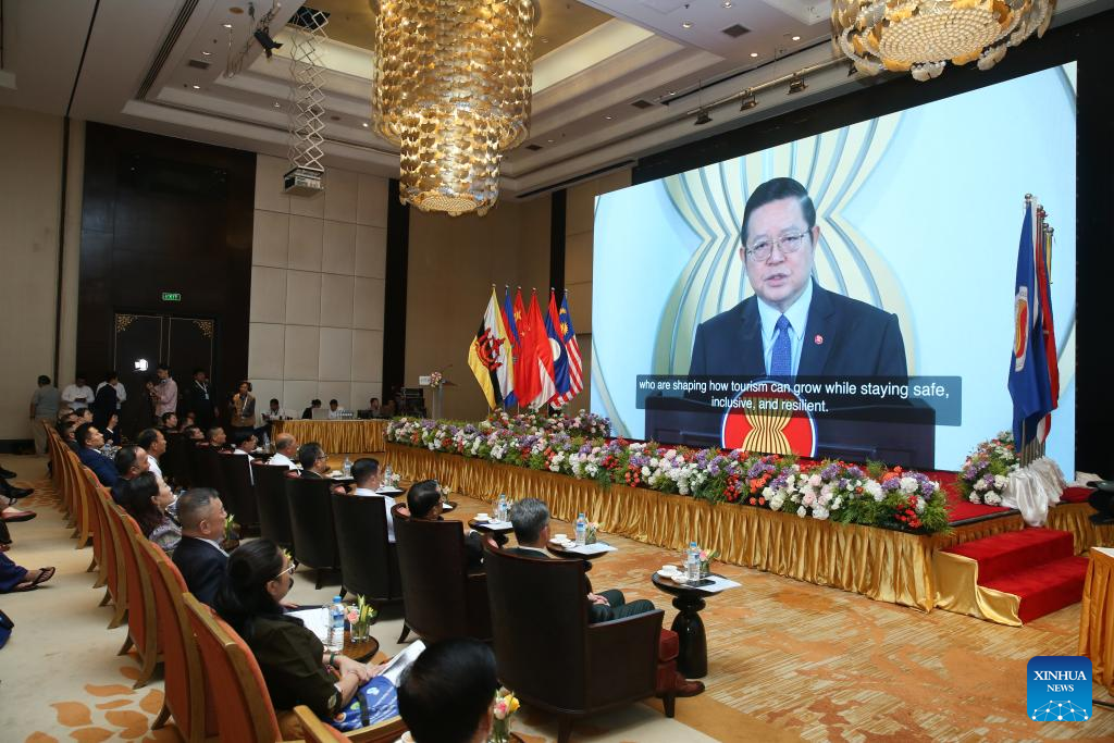 Association of Southeast Asian Nations (ASEAN) Secretary-General Kao Kim Hourn delivers a speech via video link during the ASEAN-China Tourism Security and Safety Forum in Yangon, Myanmar, Aug. 25, 2025. The forum was jointly organized by the ASEAN-China Centre (ACC), the Ministry of Hotels and Tourism of Myanmar, and the Lancang-Mekong Integrated Law Enforcement and Security Cooperation Center (LMLECC). It focused on building a solid safety barrier, advancing regional tourism development and prosperity, and exploring practical measures to address challenges. (Photo by Myo Kyaw Soe/Xinhua)