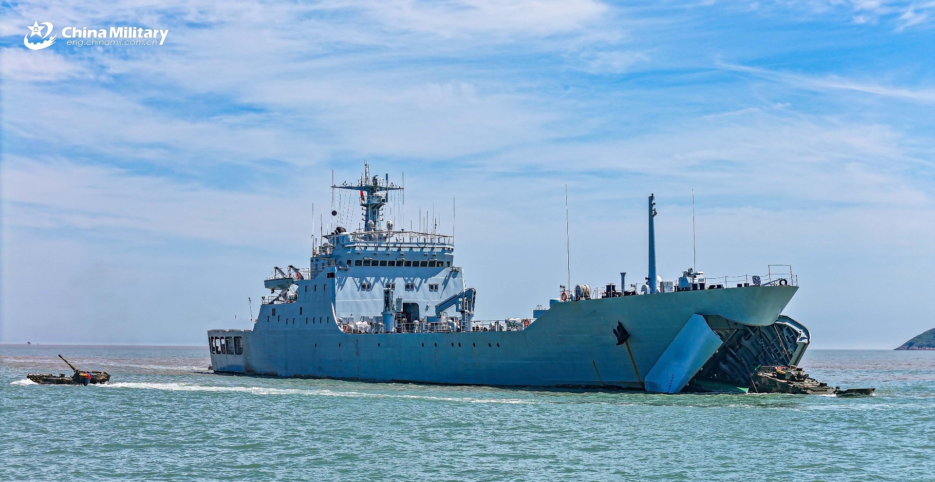 An armored amphibious infantry fighting vehicle (IFV) attached to the Chinese PLA 72nd Group Army debarks the well deck of a landing ship during a joint training exercise with a naval unit. (eng.chinamil.com.cn/Photo by Zhong Zhihao)