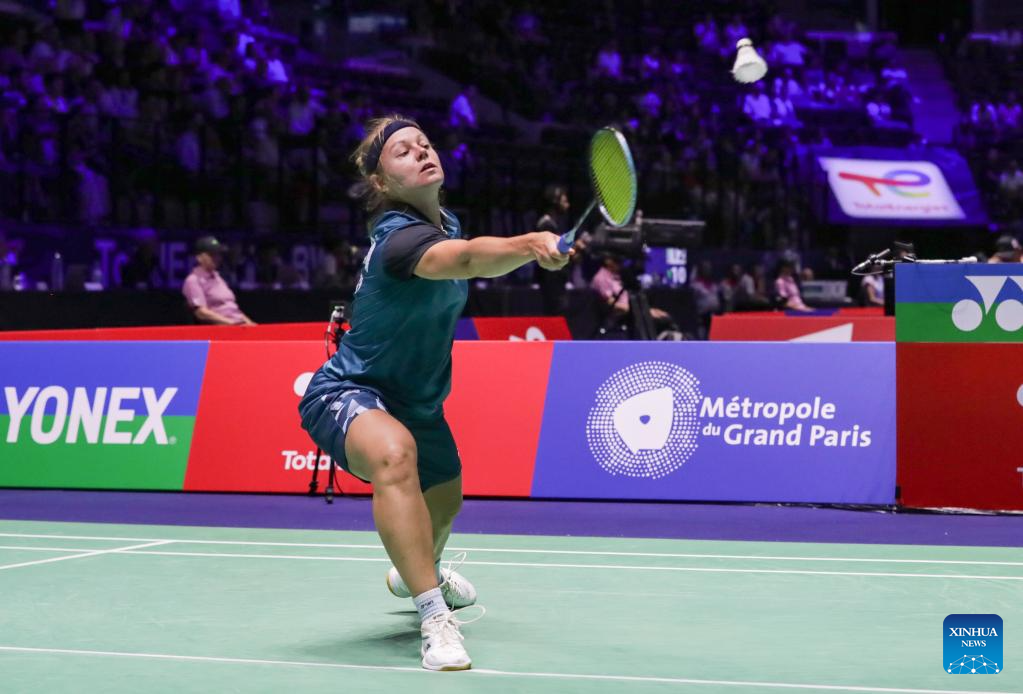 Agnes Korosi of Hungary hits a return during the women's singles first round match against Wang Zhiyi of China at the BWF World Championships 2025 in Paris, France, Aug. 26, 2025. (Xinhua/Zhang Fan)