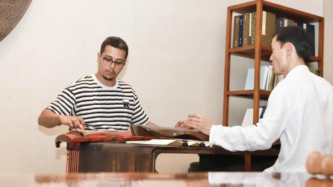 A foreign tourist learns a traditional Chinese musical instrument in Boao, south China's Hainan province. (Photo from the WeChat official account of Boao Lecheng International Medical Tourism Pilot Zone Administration)