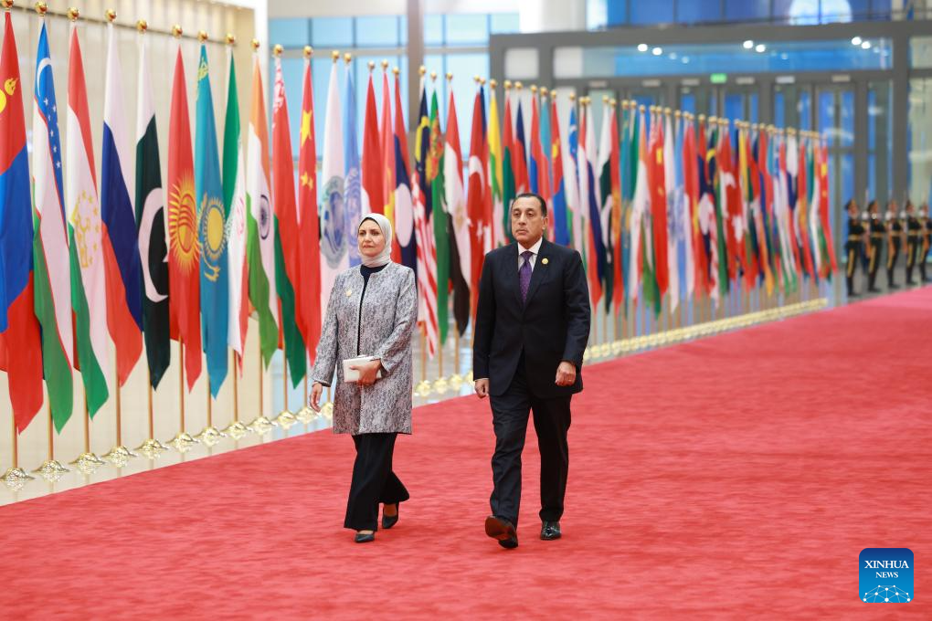Egyptian Prime Minister Mostafa Madbouly and his wife arrive at the Meijiang Convention and Exhibition Center for a welcoming banquet in Tianjin, north China, Aug. 31, 2025. Chinese President Xi Jinping and his wife, Peng Liyuan, on Sunday hosted a banquet in China's port city of Tianjin to welcome international guests who are here to attend the Shanghai Cooperation Organization (SCO) Summit 2025. (Xinhua/Ding Haitao)