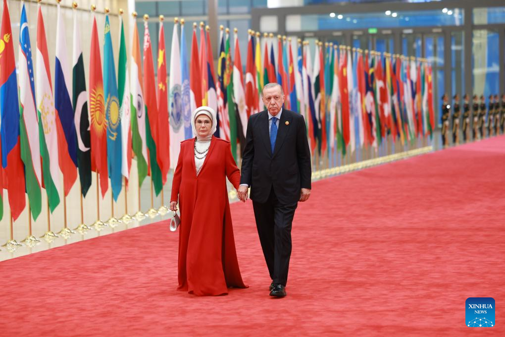 Turkish President Recep Tayyip Erdogan and his wife arrive at the Meijiang Convention and Exhibition Center for a welcoming banquet in Tianjin, north China, Aug. 31, 2025. Chinese President Xi Jinping and his wife, Peng Liyuan, on Sunday hosted a banquet in China's port city of Tianjin to welcome international guests who are here to attend the Shanghai Cooperation Organization (SCO) Summit 2025. (Xinhua/Ding Haitao)