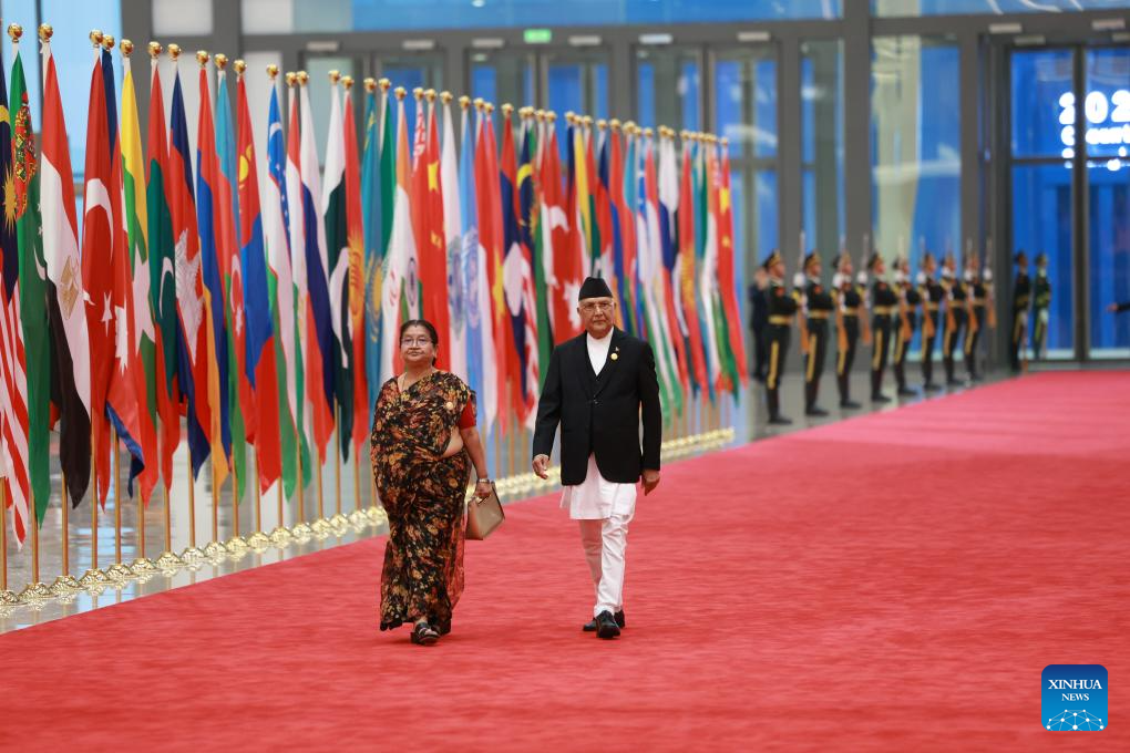 Nepali Prime Minister KP Sharma Oli and his wife arrive at the Meijiang Convention and Exhibition Center for a welcoming banquet in Tianjin, north China, Aug. 31, 2025. Chinese President Xi Jinping and his wife, Peng Liyuan, on Sunday hosted a banquet in China's port city of Tianjin to welcome international guests who are here to attend the Shanghai Cooperation Organization (SCO) Summit 2025. (Xinhua/Ding Haitao)