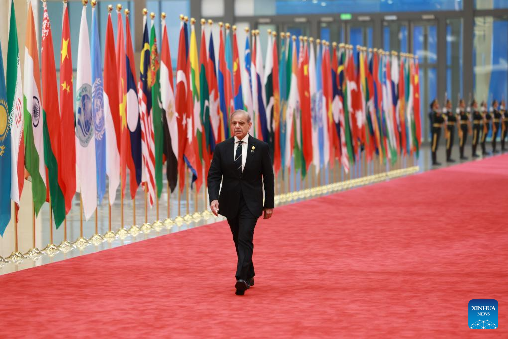 Pakistani Prime Minister Shehbaz Sharif arrives at the Meijiang Convention and Exhibition Center for a welcoming banquet in Tianjin, north China, Aug. 31, 2025. Chinese President Xi Jinping and his wife, Peng Liyuan, on Sunday hosted a banquet in China's port city of Tianjin to welcome international guests who are here to attend the Shanghai Cooperation Organization (SCO) Summit 2025. (Xinhua/Ding Haitao)