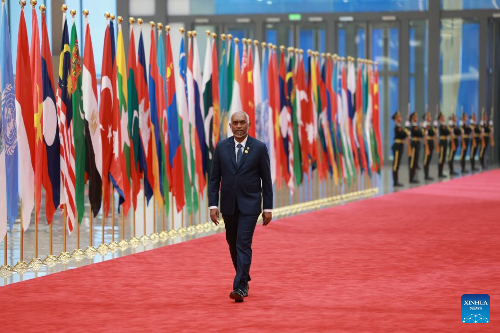 Maldivian President Mohamed Muizzu arrives at the Meijiang Convention and Exhibition Center for a welcoming banquet in Tianjin, north China, Aug. 31, 2025. Chinese President Xi Jinping and his wife, Peng Liyuan, on Sunday hosted a banquet in China's port city of Tianjin to welcome international guests who are here to attend the Shanghai Cooperation Organization (SCO) Summit 2025. (Xinhua/Ding Haitao)