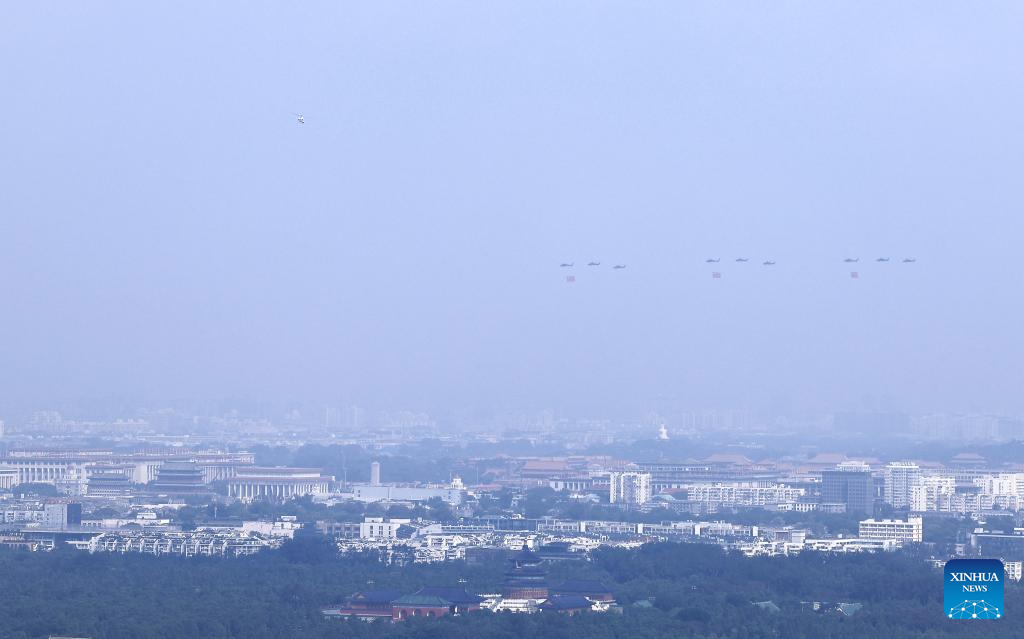 The flag-guarding air echelon flies over Tian'anmen Square during a grand gathering to commemorate the 80th anniversary of the victory in the Chinese People's War of Resistance against Japanese Aggression and the World Anti-Fascist War in Beijing, capital of China, Sept. 3, 2025. (Xinhua/Yang Guanyu)