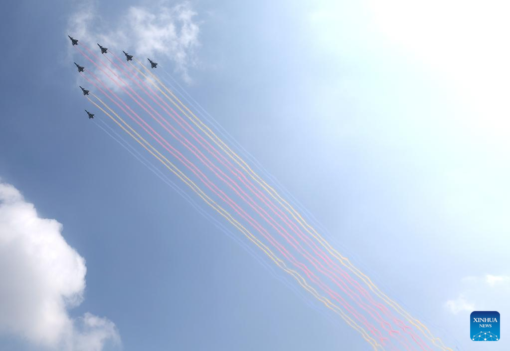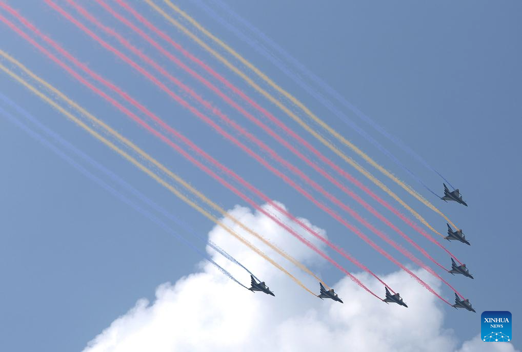 The echelon of trainer aircraft attends a parade during a grand gathering to commemorate the 80th anniversary of the victory in the Chinese People's War of Resistance against Japanese Aggression and the World Anti-Fascist War in Beijing, capital of China, Sept. 3, 2025. (Xinhua/Meng Yongmin)