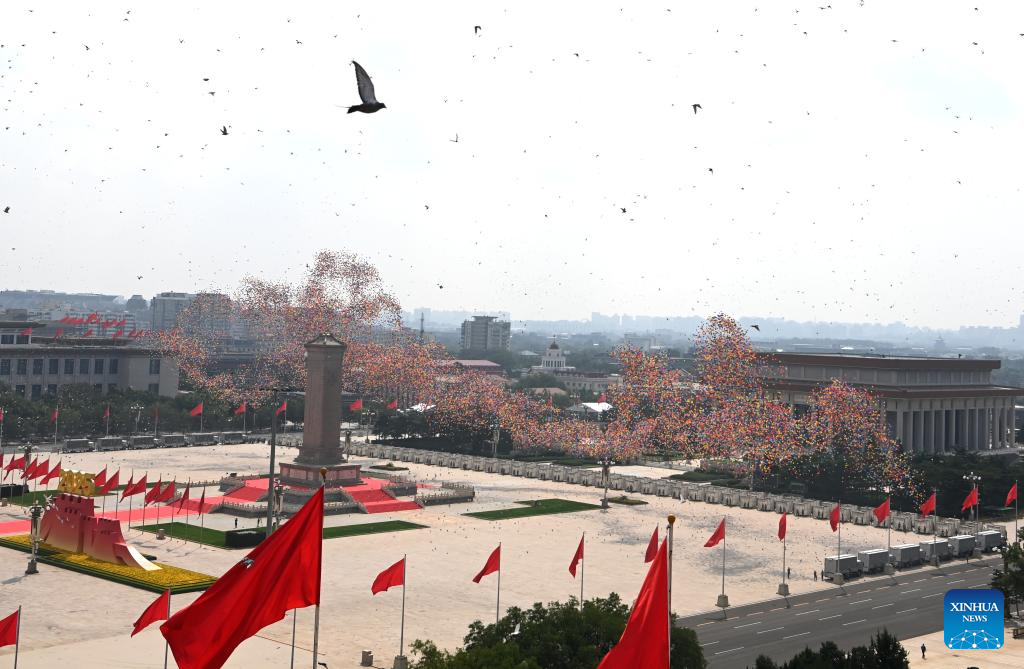 Pigeons and balloons are released during a grand gathering to commemorate the 80th anniversary of the victory in the Chinese People's War of Resistance against Japanese Aggression and the World Anti-Fascist War in Beijing, capital of China, Sept. 3, 2025. (Xinhua/Ma Ning)