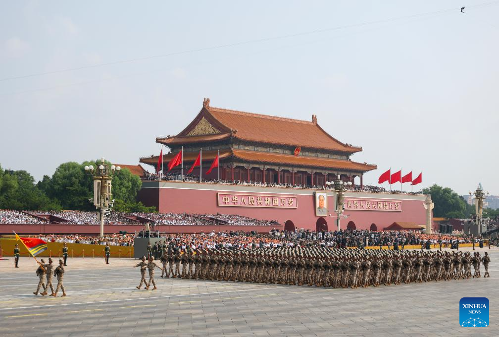 The hero units' banner formation attends a military parade in Beijing, capital of China, Sept. 3, 2025. China on Wednesday held a grand gathering to commemorate the 80th anniversary of the victory in the Chinese People's War of Resistance against Japanese Aggression and the World Anti-Fascist War. (Xinhua/Ma Ning)