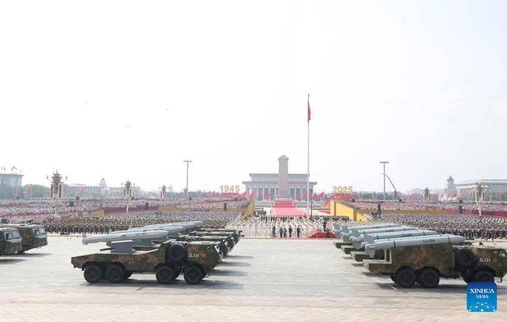 The hypersonic missile formation attends a military parade in Beijing, capital of China, Sept. 3, 2025. China on Wednesday held a grand gathering to commemorate the 80th anniversary of the victory in the Chinese People's War of Resistance against Japanese Aggression and the World Anti-Fascist War. (Xinhua/Liu Dawei)