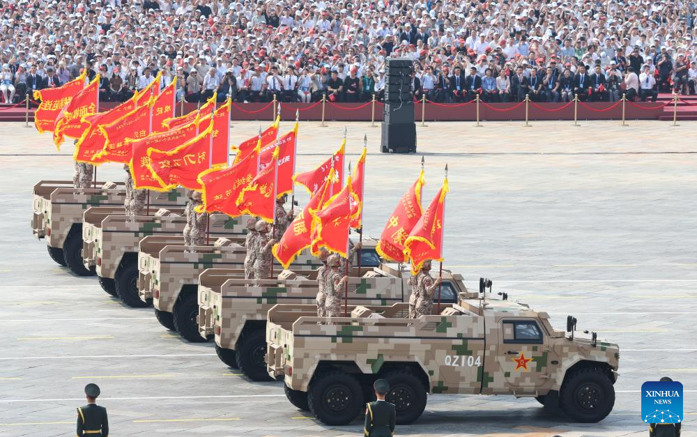 Hero units' banner formation marches through Tian'anmen Square during a military parade in Beijing, capital of China, Sept. 3, 2025. China on Wednesday held a grand gathering to commemorate the 80th anniversary of the victory in the Chinese People's War of Resistance against Japanese Aggression and the World Anti-Fascist War. (Xinhua/Pan Yulong)