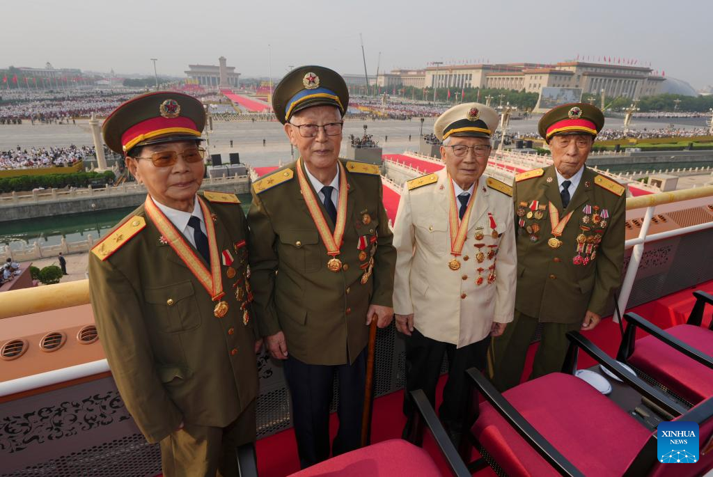 Veterans are pictured at Tian'anmen Rostrum ahead of a military parade in Beijing, capital of China, Sept. 3, 2025. China on Wednesday held a grand gathering to commemorate the 80th anniversary of the victory in the Chinese People's War of Resistance against Japanese Aggression and the World Anti-Fascist War. (Xinhua/Cai Yang)