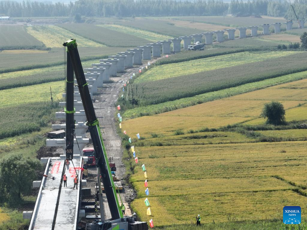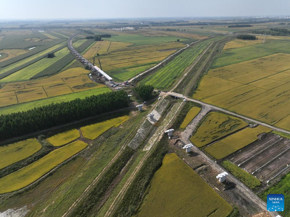 This photo taken on Sept. 5, 2025 shows a construction site of the Tongjiang super major bridge in northeast China's Heilongjiang Province. The Tongjiang super major bridge, part of the capacity expansion and renovation project for the Jiamusi-Tongjiang Railway, started beam erection on Friday.