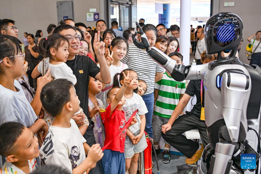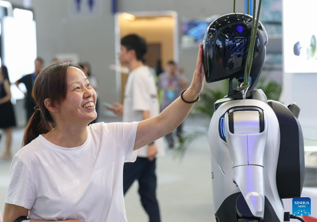 Visitors interact with a home service robot during the World Smart Industry Expo 2025 in southwest China's Chongqing Municipality, Sept. 6, 2025. The World Smart Industry Expo 2025 kicked off on Friday in southwest China's Chongqing Municipality, showcasing advanced achievements including AI rehabilitation systems, portable wearable devices, elderly care robots, and senior-friendly equipment. (Xinhua/Chen Cheng)