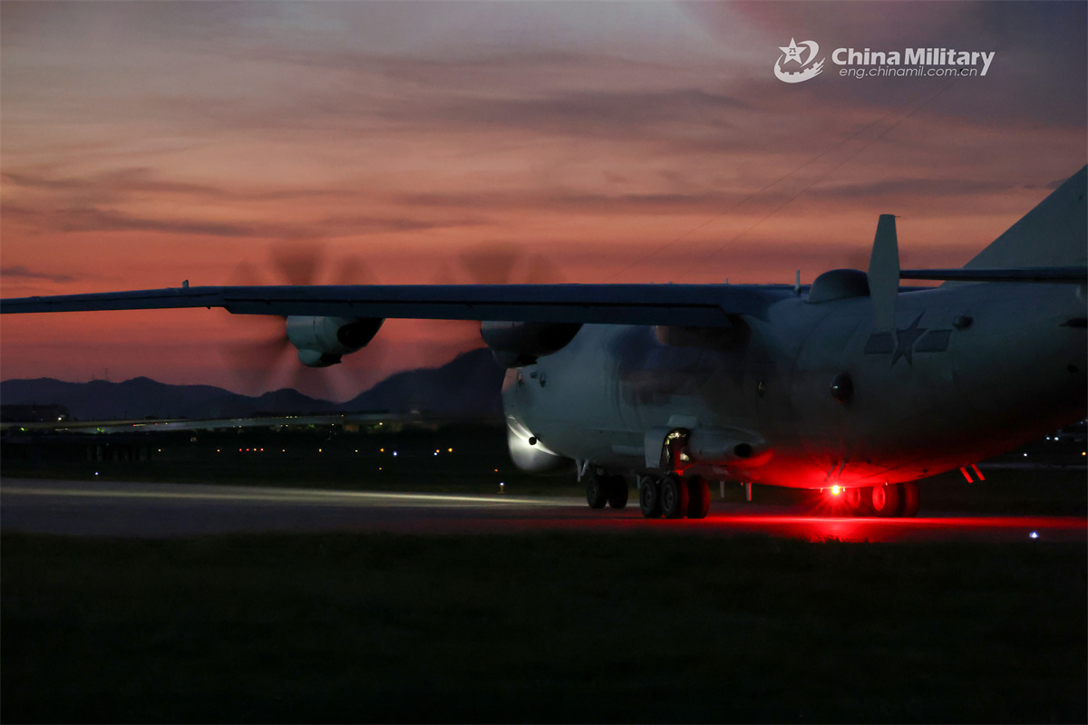 Y-9 transport aircraft attached to an aviation regiment with the navy under the Chinese PLA Eastern Theater Command taxis on the runway during a day-and-night flight training exercise on August 21, 2025. (eng.chinamil.com.cn/Photo by Wang Haojing)