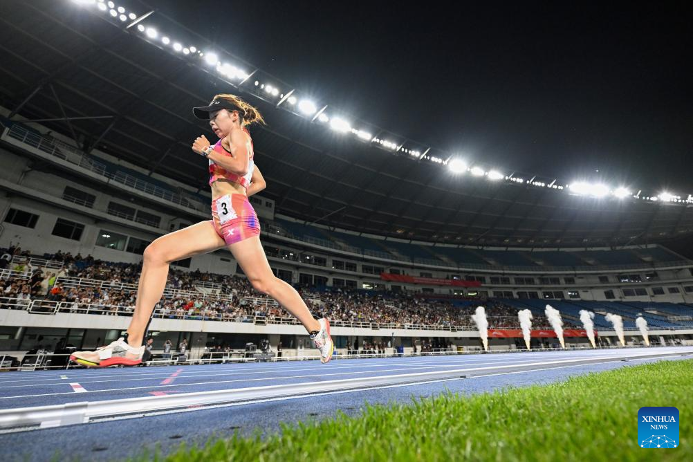 Liang Tiantian of China competes during the Women's 3000M event at 2025 World Athletics Continental Tour in Beijing, China, on Sept. 7, 2025. (Xinhua/Ju Huanzong)