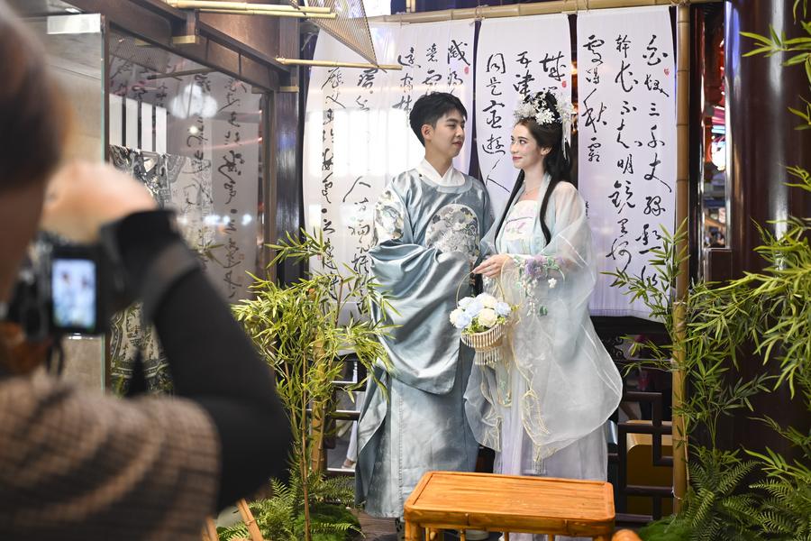 Tourists from Austria wearing Hanfu attires pose for photos at Yuyuan Garden Mall in Shanghai, east China, July 21, 2025. (Xinhua/Chen Haoming)