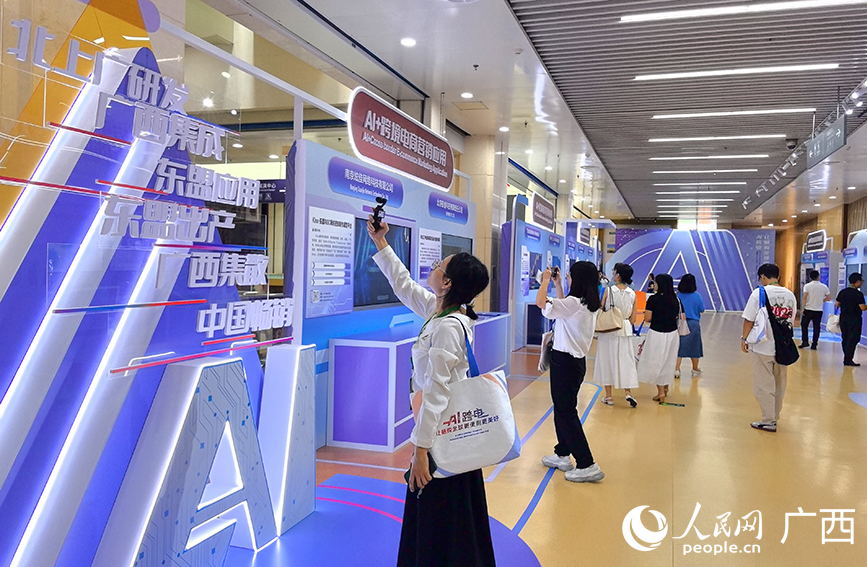 Visitors tour an exhibition displaying outstanding projects from the 2025 China-ASEAN "AI+Cross-border E-Commerce" Innovative Application Competition in Nanning, south China's Guangxi Zhuang Autonomous Region, Sept. 5, 2025. (People's Daily Online/Fu Huazhou)