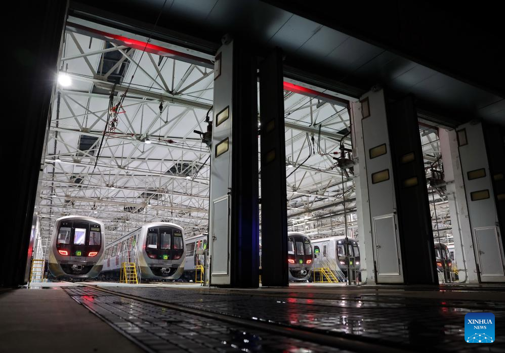 A staff member inspects trains before operation in Shijiazhuang, north China's Hebei Province, Sept. 9, 2025. As of the first half of 2025, the Shijiazhuang Metro has operated a total of 2.0083 million train trips, safely transporting 942 million passengers. Initiated in June 2017, the city's metro system now stretches 78.2 kilometers with 60 stations in service. (Photo by Zhang Xiaofeng/Xinhua)