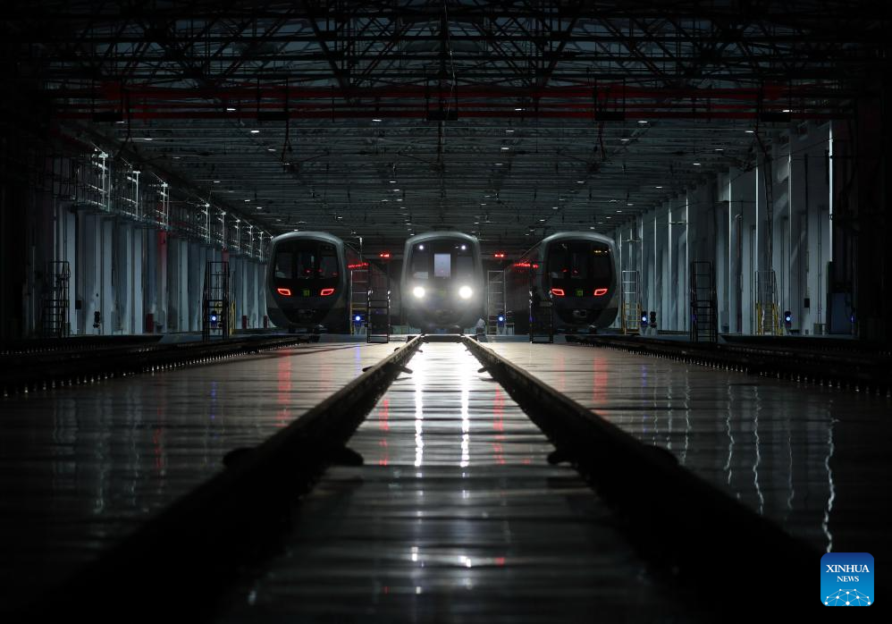 Metro trains are seen before operation in Shijiazhuang, north China's Hebei Province, Sept. 9, 2025. As of the first half of 2025, the Shijiazhuang Metro has operated a total of 2.0083 million train trips, safely transporting 942 million passengers. Initiated in June 2017, the city's metro system now stretches 78.2 kilometers with 60 stations in service. (Xinhua/Yang Shiyao)