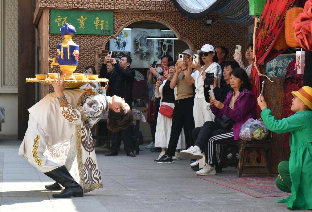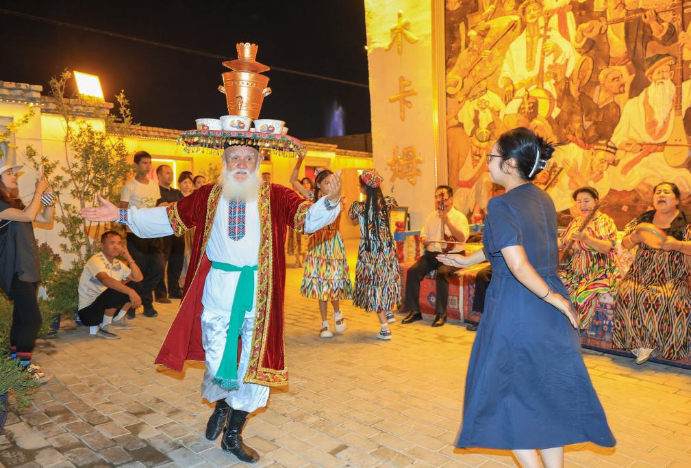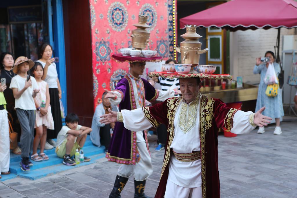 This photo shows a view of the Qiuci Alley of Kuqa City, northwest China's Xinjiang Uygur Autonomous Region, July 22, 2025. In the Qiuci Alley of Kuqa City, northwest China's Xinjiang Uygur Autonomous Region, Parhat Emin performs the Samawar (a Uygur term meaning "tea set") dance, a traditional Uygur greeting dance with a history dating back to the millennium-old ancient Qiuci State. His eyes shine brightly, and his smile is warm and welcoming. With a bronze pot and porcelain bowls balanced steadily on a plate over his head, his body spins smoothly, and his feet move as lightly as the wind. As he dances gracefully to the rhythm of traditional Uygur music, the surrounding audience burst into cheers from time to time. (Xinhua/Wang Jingqiang)