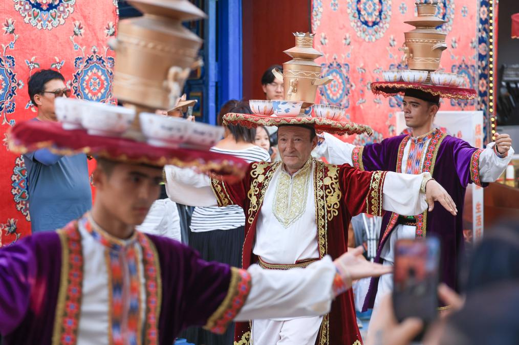 Performers participate in a wedding ceremony in the Qiuci Alley of Kuqa City, northwest China's Xinjiang Uygur Autonomous Region, July 22, 2025. In the Qiuci Alley of Kuqa City, northwest China's Xinjiang Uygur Autonomous Region, Parhat Emin performs the Samawar (a Uygur term meaning "tea set") dance, a traditional Uygur greeting dance with a history dating back to the millennium-old ancient Qiuci State. His eyes shine brightly, and his smile is warm and welcoming. With a bronze pot and porcelain bowls balanced steadily on a plate over his head, his body spins smoothly, and his feet move as lightly as the wind. As he dances gracefully to the rhythm of traditional Uygur music, the surrounding audience burst into cheers from time to time. (Xinhua/Wang Fei)