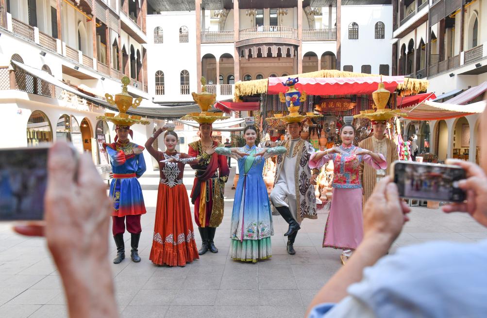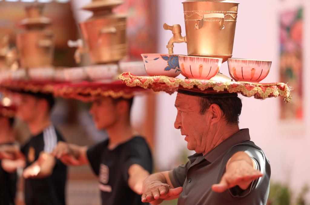 Artists perform the Samawar dance at the Grand Bazaar in Urumqi, northwest China's Xinjiang Uygur Autonomous Region, Sept. 9, 2025. In the Qiuci Alley of Kuqa City, northwest China's Xinjiang Uygur Autonomous Region, Parhat Emin performs the Samawar (a Uygur term meaning "tea set") dance, a traditional Uygur greeting dance with a history dating back to the millennium-old ancient Qiuci State. His eyes shine brightly, and his smile is warm and welcoming. With a bronze pot and porcelain bowls balanced steadily on a plate over his head, his body spins smoothly, and his feet move as lightly as the wind. As he dances gracefully to the rhythm of traditional Uygur music, the surrounding audience burst into cheers from time to time. (Xinhua/Wang Fei)