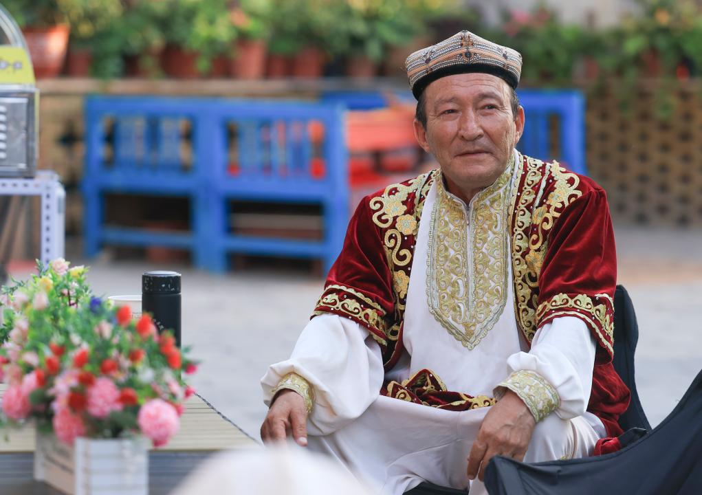 Parhat Emin takes a break in the Qiuci Alley of Kuqa City, northwest China's Xinjiang Uygur Autonomous Region, July 22, 2025. In the Qiuci Alley of Kuqa City, northwest China's Xinjiang Uygur Autonomous Region, Parhat Emin performs the Samawar (a Uygur term meaning "tea set") dance, a traditional Uygur greeting dance with a history dating back to the millennium-old ancient Qiuci State. His eyes shine brightly, and his smile is warm and welcoming. With a bronze pot and porcelain bowls balanced steadily on a plate over his head, his body spins smoothly, and his feet move as lightly as the wind. As he dances gracefully to the rhythm of traditional Uygur music, the surrounding audience burst into cheers from time to time. (Xinhua/Wang Fei)